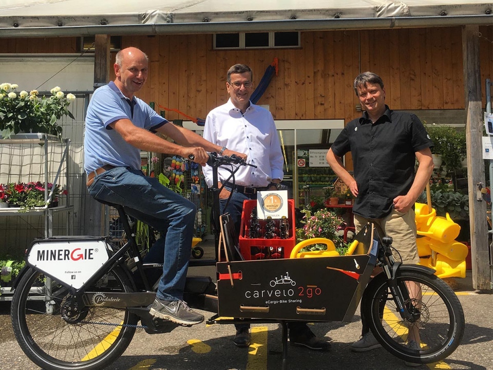 Nel Minergie-Rating 2018, i Comuni giunti al primo posto hanno vinto una bici Carvelo della piattaforma di condivisione carvelo2go per un anno intero. Qualche settimana fa è stata lanciata la Cargo Bike sponsorizzata da Minergie nei tre Comuni vincitori: