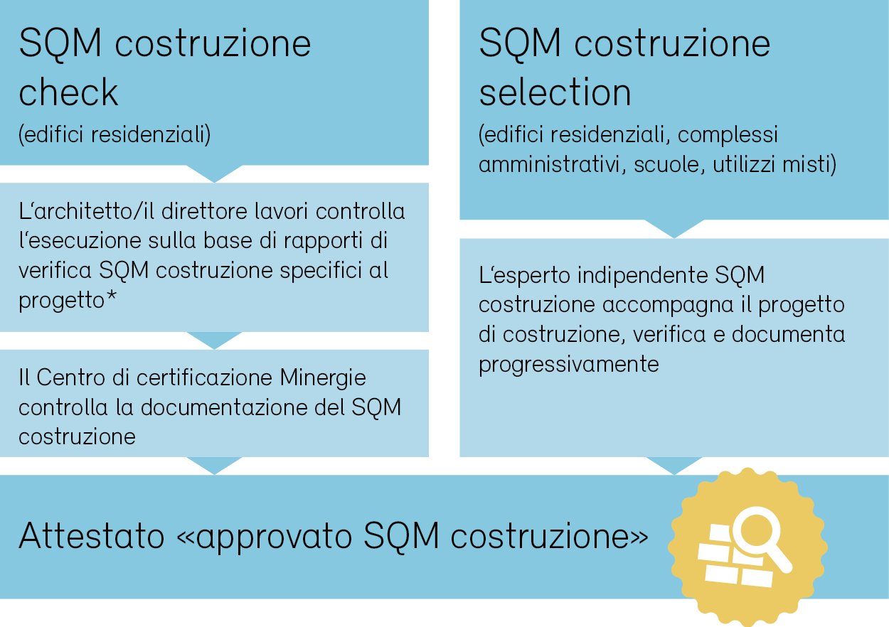 SQM costruzione (Sistema di Qualità Minergie costruzione), rappresenta la massima qualità nella fase di costruzione. Ogni progetto di costruzione è individuale, i processi quasi sempre complessi. A causa delle diverse persone coinvolte nella costruzione, si creano diversi punti d‘intersezione. SQM costruzione aiuta a mantenere la visione d‘insieme. Il sistema di qualità è semplice e standardizzato. Esso controlla sistematicamente le componenti rilevanti per Minergie e ne documenta i risultati.